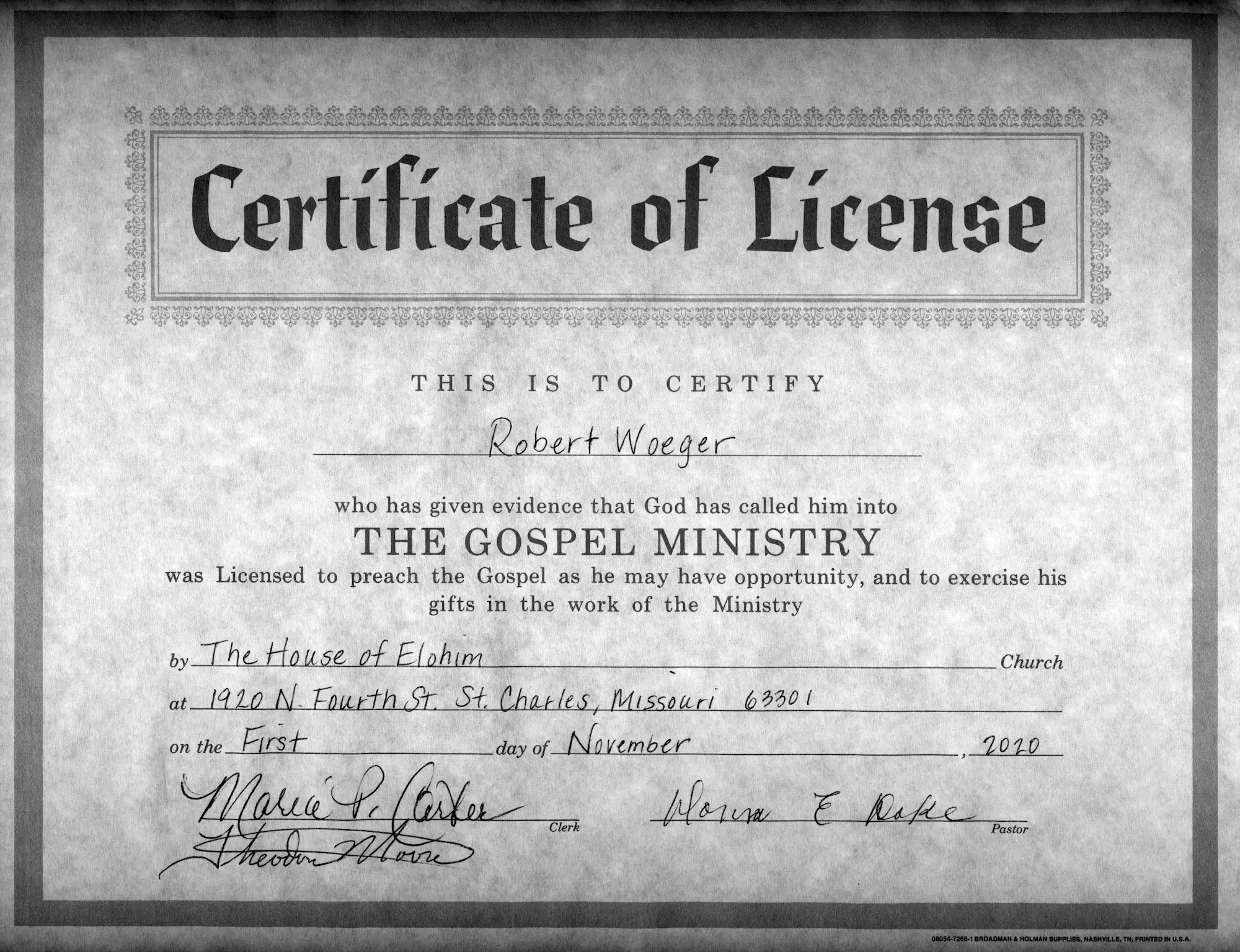 Robert Woeger has been an ordained Christian Minister since 1990, and has received God’s Call to minister, along with receiving various Bible College degrees, ordinations, and ministerial licenses from different Christian Bible Colleges, churches and ministries. Robert Woeger has preached in many different Christian Churches for many years, has travelled around the world ministering, and organized Christian meetings.